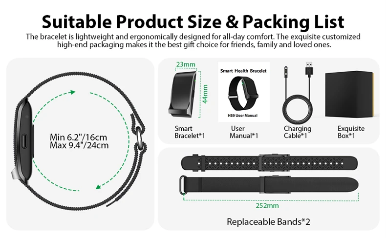 Functions: call reminder, find bracelet, alarm clock, camera control, do not disturb mode, OTA, all-day blood oxygen monitoring, all-day blood pressure monitoring, all-day